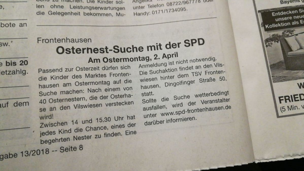 Passend zur Osterzeit dürfen sich die Kinder des Marktes Frontenhausen am Ostermontag auf die Suche machen: Nach einem von 40 Osternestern, die der Osterhase an den Vilswiesen verstecken wird! Zwischen 14:00 und 15:30 hat jedes Kind die Chance, eines der begehrten Nester zu finden.